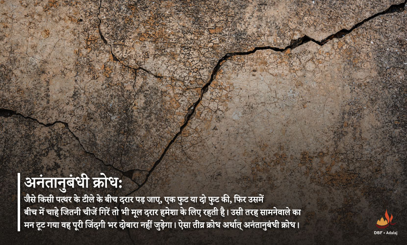 अनंतानुबंधी क्रोध: क्रोध से सामनेवाले व्यक्ति को ऐसे शब्द सुना दिए जिससे सामनेवाले का मन ऐसा टूट गया कि जिंदगीभर नहीं जुड़ेगा। ऐसे हमेशा के लिए मन टूट जाता है ऐसा क्रोध अर्थात् अनंतानुबंधी क्रोध। जो अनंत अवतार तक भटका दे वैसा यह क्रोध है। जैसे किसी पत्थर के टीले के बीच दरार पड़ जाए, एक फुट या दो फुट की, फिर उसमें बीच में चाहे जितनी चीजें गिरें तो भी मूल दरार हमेशा के लिए रहती है। उसी तरह सामनेवाले का मन टूट गया वह पूरी जिंदगी भर दोबारा नहीं जुड़ेगा। ऐसा तीव्र क्रोध अर्थात् अनंतानुबंधी क्रोध।