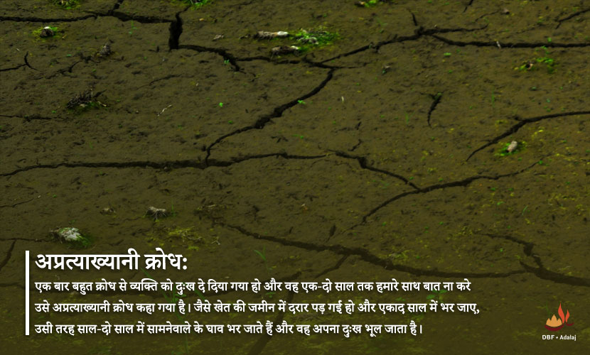 अप्रत्याख्यानी क्रोध: दूसरे प्रकार का क्रोध अर्थात् अप्रत्याख्यानी क्रोध। एक बार बहुत क्रोध से व्यक्ति को दुःख दे दिया गया हो और वह एक-दो साल तक हमारे साथ बात ना करे उसे अप्रत्याख्यानी क्रोध कहा गया है। जैसे खेत की जमीन में दरार पड़ गई हो और एकाद साल में भर जाए, उसी तरह साल-दो साल में सामनेवाले के घाव भर जाते हैं और वह अपना दुःख भूल जाता है। शास्त्रों की भाषा में क्रोध हो जाने के बाद करने वाले ने उसका पछतावा नहीं किया, पश्चाताप नहीं किया और इतने लंबे समय तक सामनेवाले को उसकी असर रही उस क्रोध को अप्रत्याख्यानी क्रोध कहा गया है।