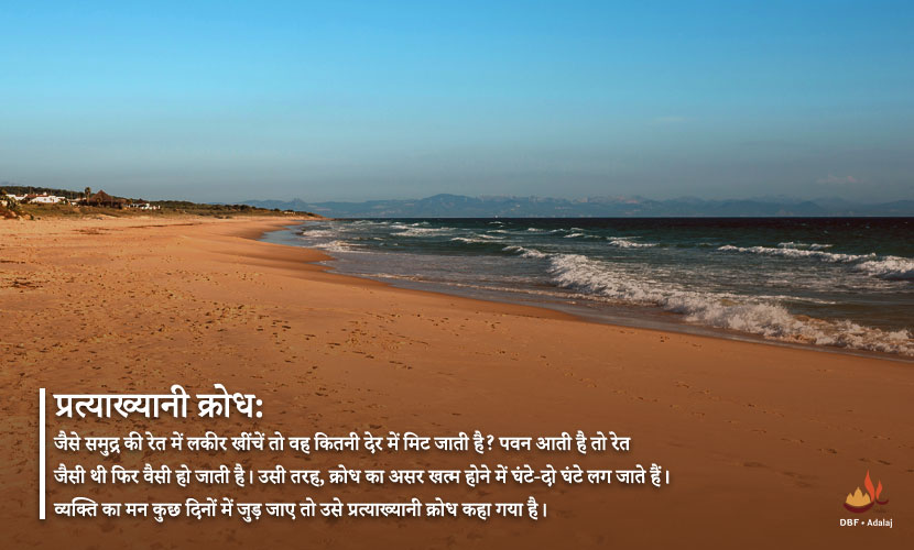 प्रत्याख्यानी क्रोध: क्रोध करने के बाद खुद पछतावा करे और पंद्रह दिनों में सामनेवाला सब भूल जाए, दोनों फिर बोलने लग जाएँ तो यह प्रत्याख्यानी क्रोध कहलाएगा। जैसे समुद्र की रेत में लकीर खींचें तो वह कितनी देर में मिट जाती है? पवन आती है तो रेत जैसी थी फिर वैसी हो जाती है। उसी तरह, क्रोध का असर खत्म होने में घंटे-दो घंटे लग जाते हैं। व्यक्ति का मन कुछ दिनों में जुड़ जाए तो उसे प्रत्याख्यानी क्रोध कहा गया है।