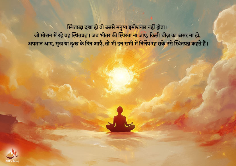 परम पूज्य दादा भगवान हमें सरल भाषा में स्थितप्रज्ञ दशा का स्पष्टीकरण करते हुए कहते हैं कि, स्थितप्रज्ञ दशा हो तो उससे मनुष्य इमोशनल नहीं होता। जो मोशन में रहे वह स्थितप्रज्ञ। जब भीतर की स्थिरता ना जाए, किसी चीज़ का असर ना हो, अपमान आए, सुख या दुःख के दिन आएँ, तो भी इन सभी में निर्लेप रह सके उसे स्थितप्रज्ञ कहते हैं। परंतु स्थितप्रज्ञ दशा से निरंतर समाधि उत्पन्न नहीं होती। जब तक स्वरूप का ज्ञान ना हो तब तक समाधि उत्पन्न नहीं होती। भ्रांति जाए तब समाधि उत्पन्न होती है!