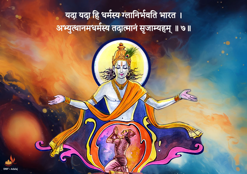 अर्थात्, “हे अर्जुन! जब-जब धर्म का अस्त होता है और अधर्म का उदय होता है, तब-तब मैं इस पृथ्वी पर प्रकट होता हूँ। सज्जनों की रक्षा करने के लिए, दुष्टों का विनाश करने के लिए और धर्म की स्थापना के लिए मैं युग-युग में जन्म लेता हूँ।”