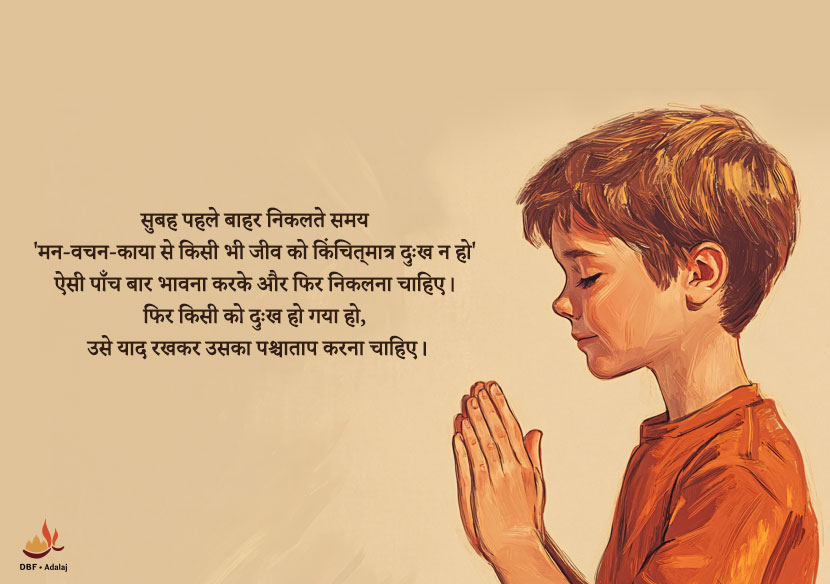 परम पूज्य दादाश्री कहते हैं कि, “सुबह पहले बाहर निकलते समय 'मन-वचन-काया से किसी भी जीव को किंचित्मात्र दुःख न हो' ऐसी पाँच बार भावना करके और फिर निकलना चाहिए। फिर किसी को दुःख हो गया हो, उसे याद रखकर उसका पश्चाताप करना चाहिए।“